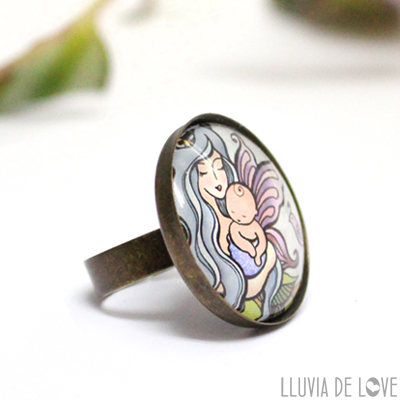 Anillo ilustrado con imagen de una hada con su bebé hadita en brazos. Una representación original y diferente de la maternidad, que también puede ser el regalo ideal para esa persona a la que tanto le gustan los seres mágicos de los bosques. Anillos para madres y mujeres que adoran las hadas. Puedes ver aquí comentarios de clientes.