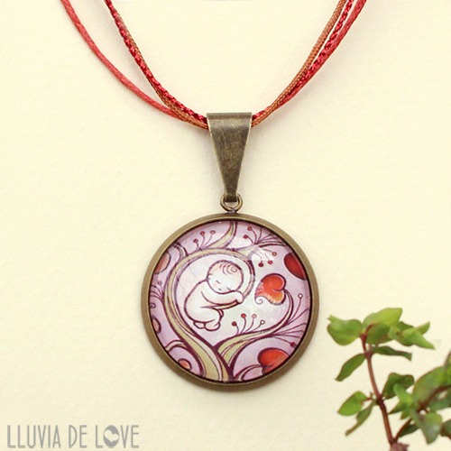 Imagen de 25x25 mm protegida por cabujón de cristal. Cordón de algodón 45 cm aprox. con cierre de mosquetón. Tono bronce antiguo. No mojar. Los tonos de la ilustración en el colgante pueden variar ligeramente respecto a los mostrados en tu pantalla.