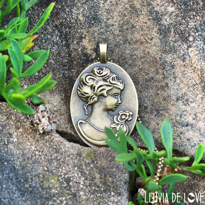 Imagen de 30x40 mm protegida por cabujón de resina. Cadena de 80 cm que puede acortarse fácilmente. Tono bronce antiguo. Lleva un precioso relieve de mujer en el reverso, que se muestra en las fotografías del artículo. No mojar. Los tonos de la ilustración en el colgante pueden variar ligeramente respecto a los mostrados en tu pantalla.