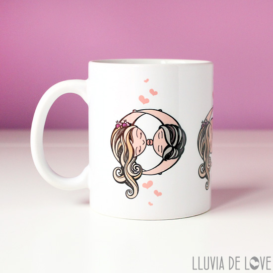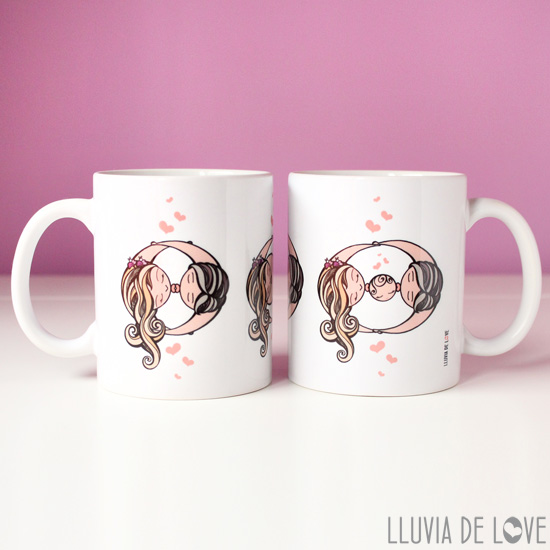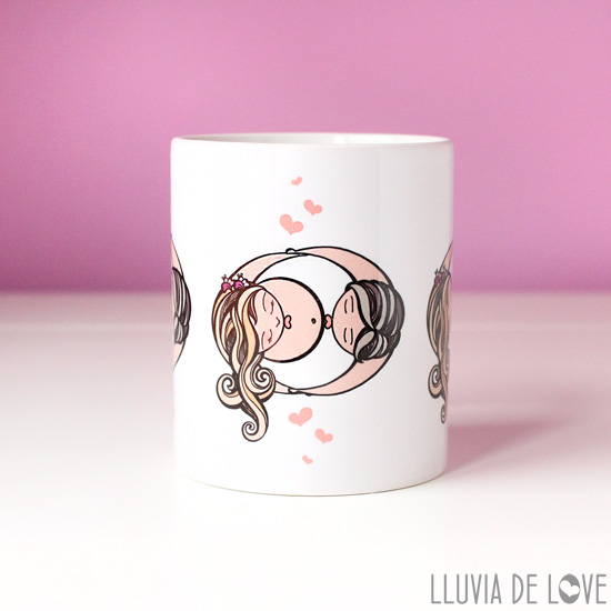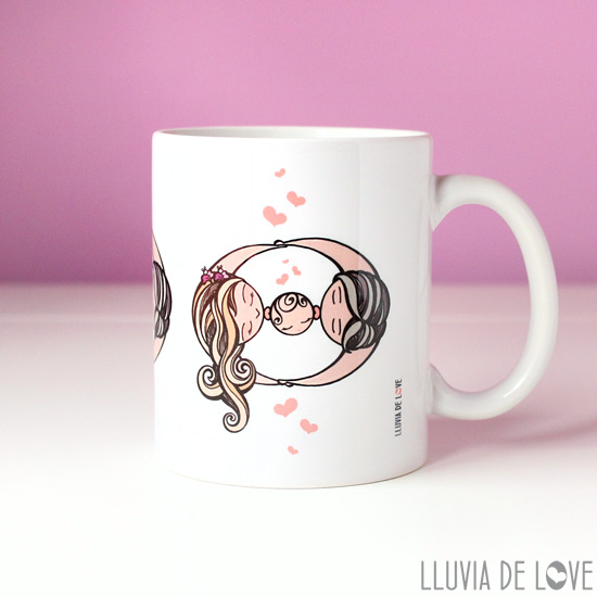 Esta taza lleva impresas tres ilustraciones que representan la evolución del amor a través del beso: el primer beso a tu pareja, el beso al vientre durante el embarazo y el beso a vuestro bebé.